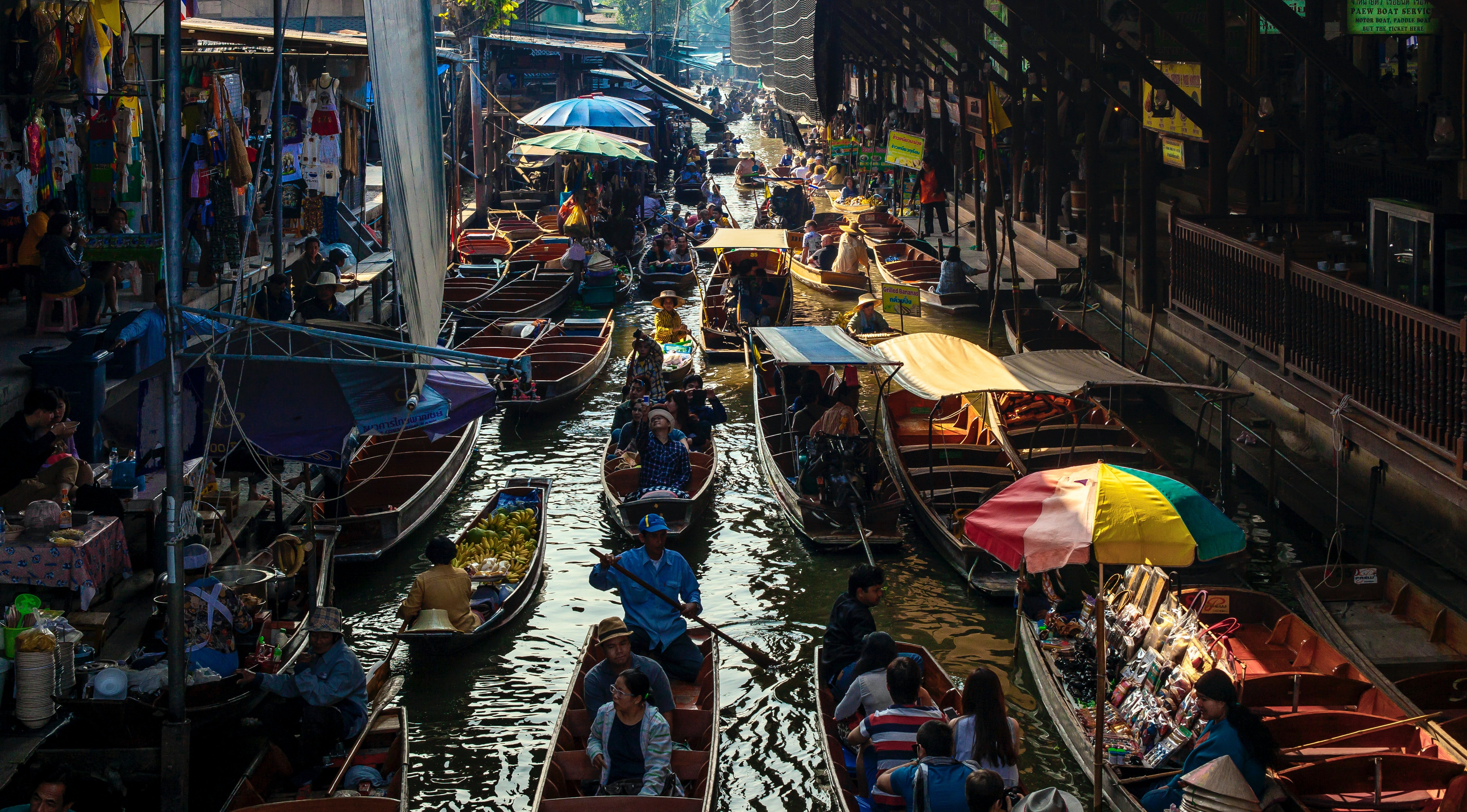 Wenn ihr in Bangkok seid, wäre es eine Schande, nicht den Damnoen Saduak Floating Market zu besuchen, den Pionier der schwimmenden Märkte in Bangkok. Hier gibt es frisches Obst, Bootsnudeln und Grillspieße, die alle auf dem Boot zubereitet werden und auf Anfrage erhältlich sind.